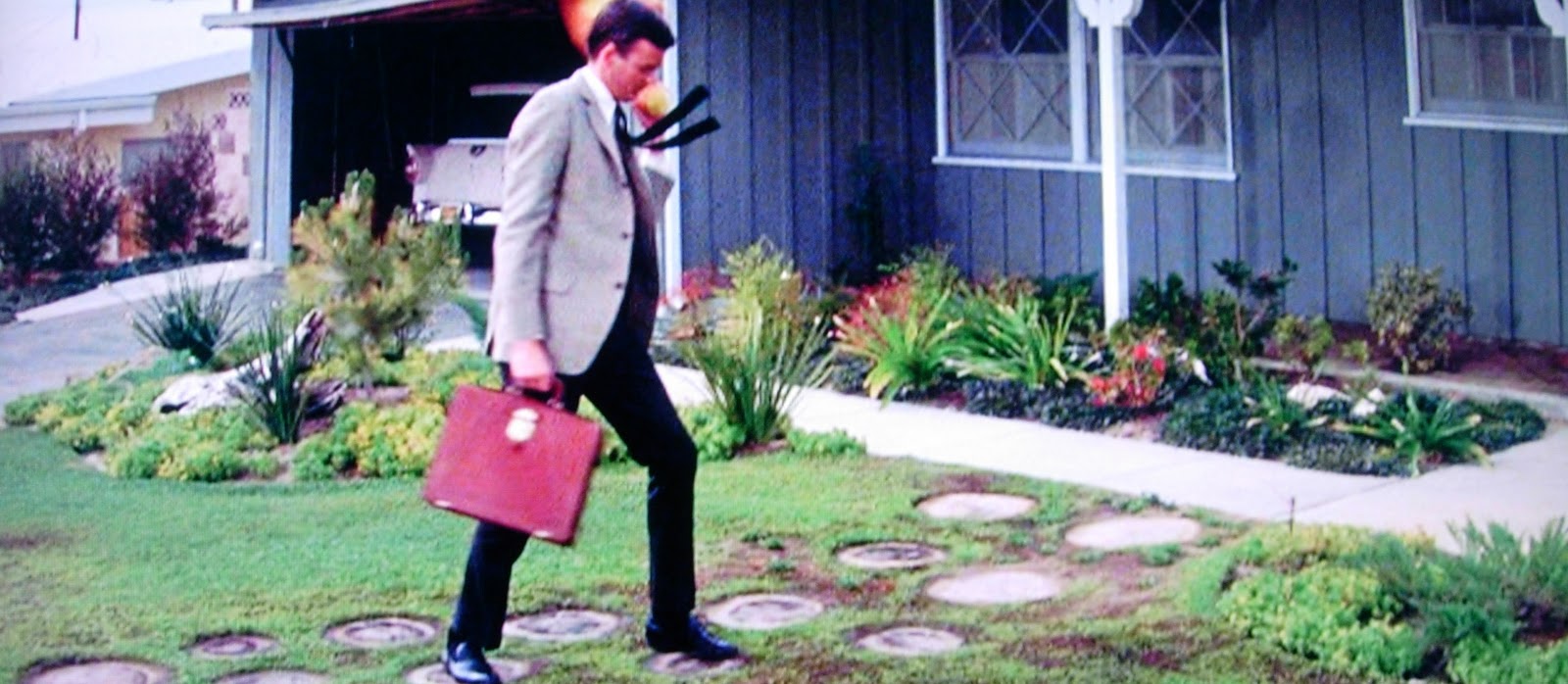 Below is an image of Hope and Turner arriving at the home in Paradise Village that Hope will be staying while conducting his research. As Turner says in the film, that house, "It's not pink, its 'California coral.'" Paradise Village is a fictional suburb and even the street signs seen in the film are fake, so you can't go by those to find the locations. Hope's home is located in the Los Angeles suburb of Woodland Hills, at address 22931 Brenford Street.