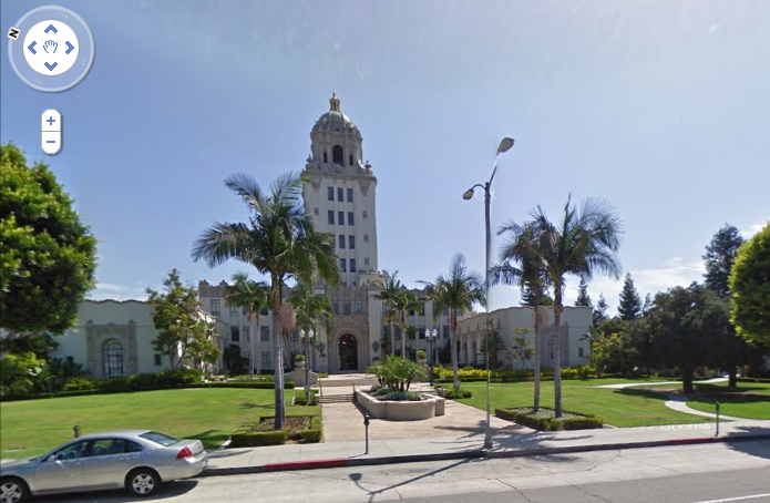 Later in the film Bogart is seen leaving the Beverly Hills post office which is located directly across from the Beverly Hills City Hall building. Below is a screenshot of Bogart and the City Hall building. As of present, the area between City Hall and the Post Office is fenced off and under construction, so I couldn't get a good photo of the City Hall building. Instead, I have a Google Street View screenshot for comparison.